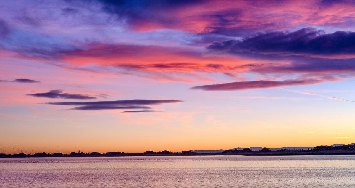 There are a lot of details in this scene that, while small and certainly secondary to the sky and water elements, I feel really add something to the image. These are the elements along the horizon: the birds (both in the water and taking flight on the left edge of the frame), the houses and their interior lights, the mountains, and the silhouettes of the trees. These elements are a bit small in the frame for my taste, but if I had shot this with a wider focal length they would become so small they’d virtually disappear.