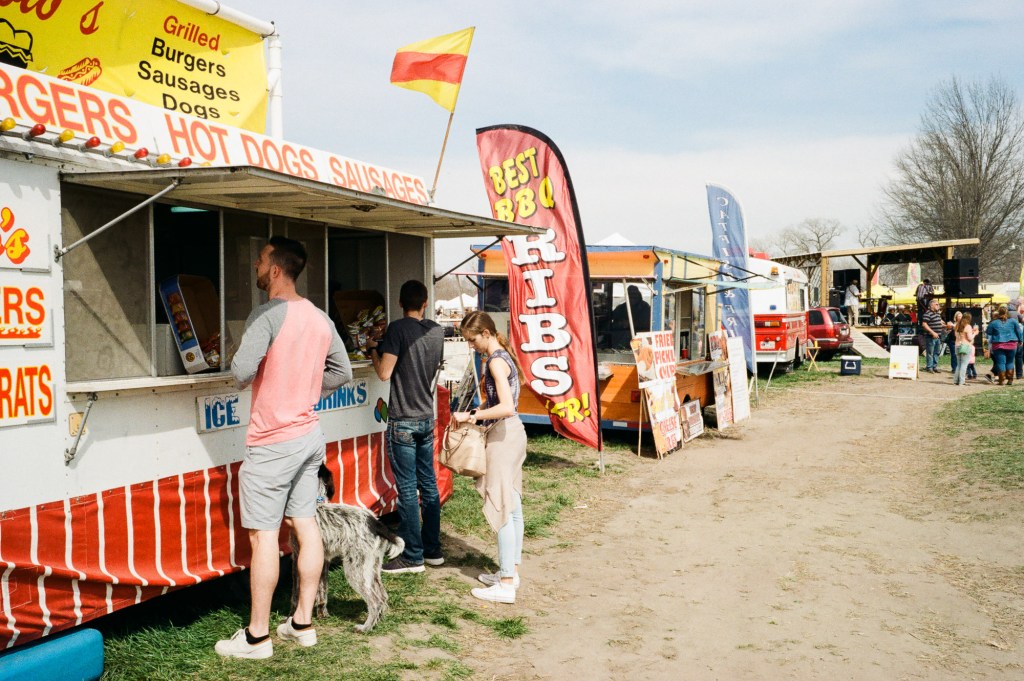 - compositionally, there’s just no subject/cohesion of the compositional elements to focus on the subject. i’d say the man ordering is the subject, but the BBQ sign draws the eye and the leading line of the road draws your eye away from him.