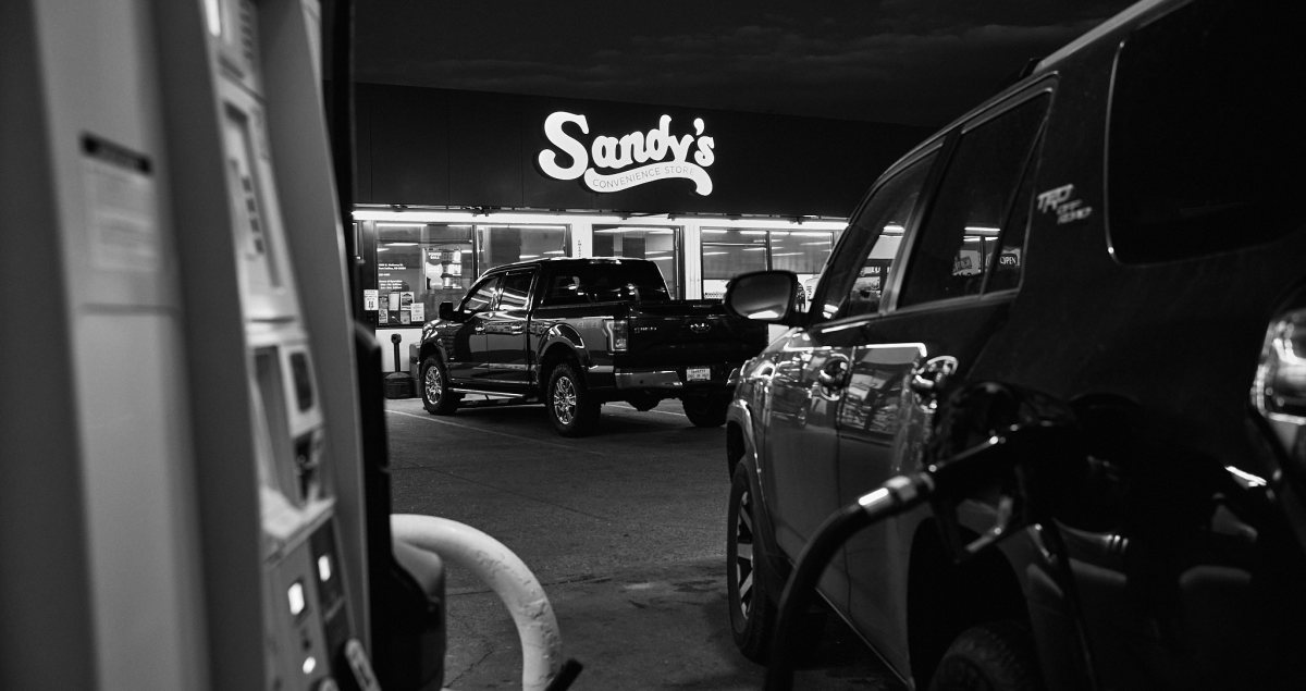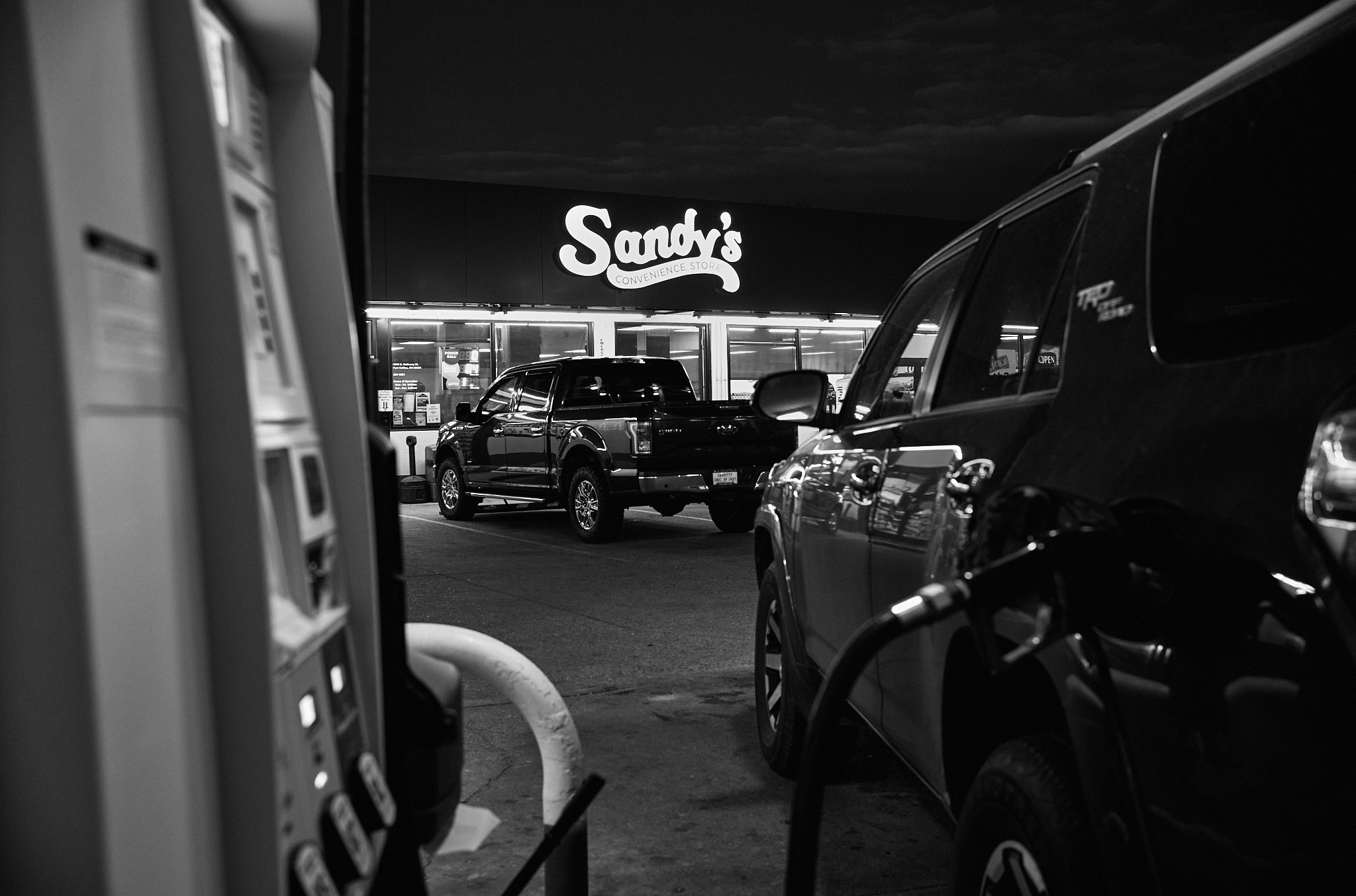 Honestly, there’s nothing especially good about the photo itself. It’s very much a typical, everyday image. If I wasn’t doing a 30 Days with… challenge I wouldn’t have made this image in the first place. But I had a little fun with the composition – note the implied “V” shape made by the gas pump on one side (which is white) and my 4Runner (which is rendered as black) on the other side that frames the truck and “Sandy’s” sign in the background) – and after applying my typical editing recipe the image really started to come to life.